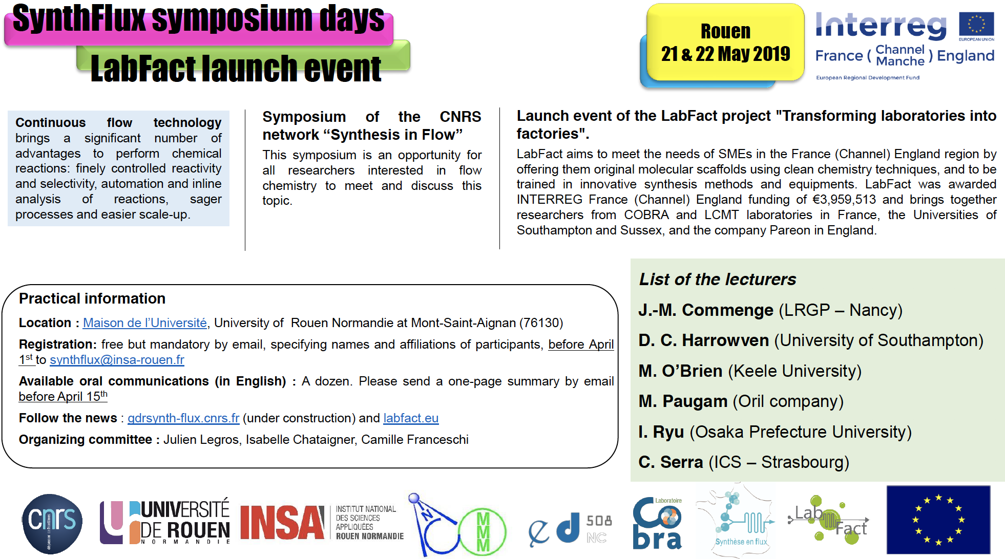 Rouen will be hosting the first LabFact launch event and training event on flow chemistry for the LabFact project! This event will be held on the 21-22 May, 2019 in Rouen and will focus on Flow Chemistry. Invited speakers include well-known academics from Keele University, Osaka Prefecture University and ICS as well as industry representatives from companies such as Oril. The event will include lectures, short communications and an industry showcase session where companies will be showcasing their wares to increase their visibility within the French(Channel)England region. For more information, please click here.